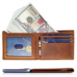 Tarjetero de identificación de cuero genuino suave de alta calidad, monedero con bloqueo RFID, billetera corta delgada plegable para hombre