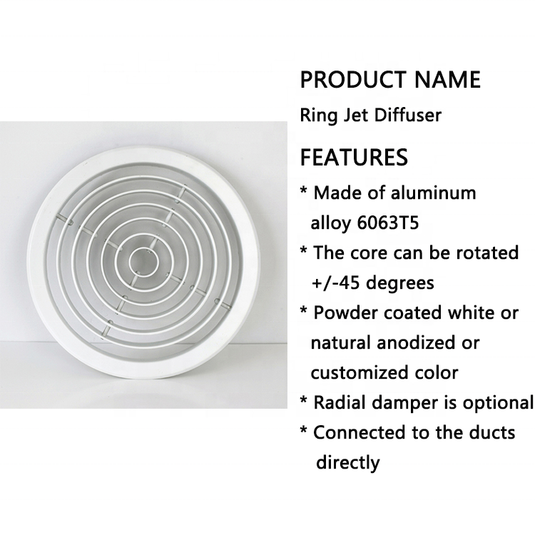 עיצוב עמיד ורב-תכליתי: מפזר טבעת אלומיניום מתכווננת זו בעלת סגנון עיצוב מודרני, תוך הקפדה על שילוב חלק בכל מערכת אוורור, במיוחד בבנייני משרדים. עמידותו משופרת על ידי שימוש בחומר אלומיניום באיכות גבוהה.