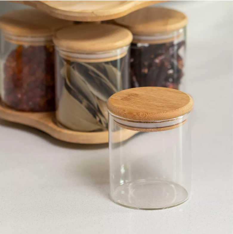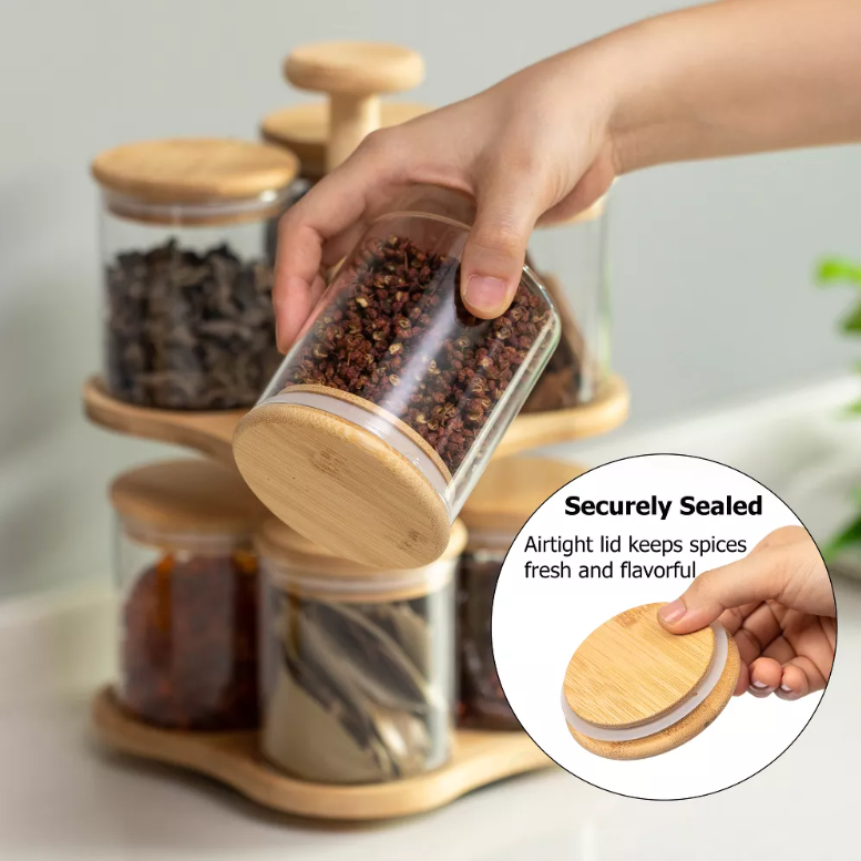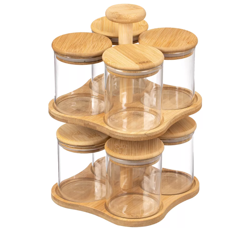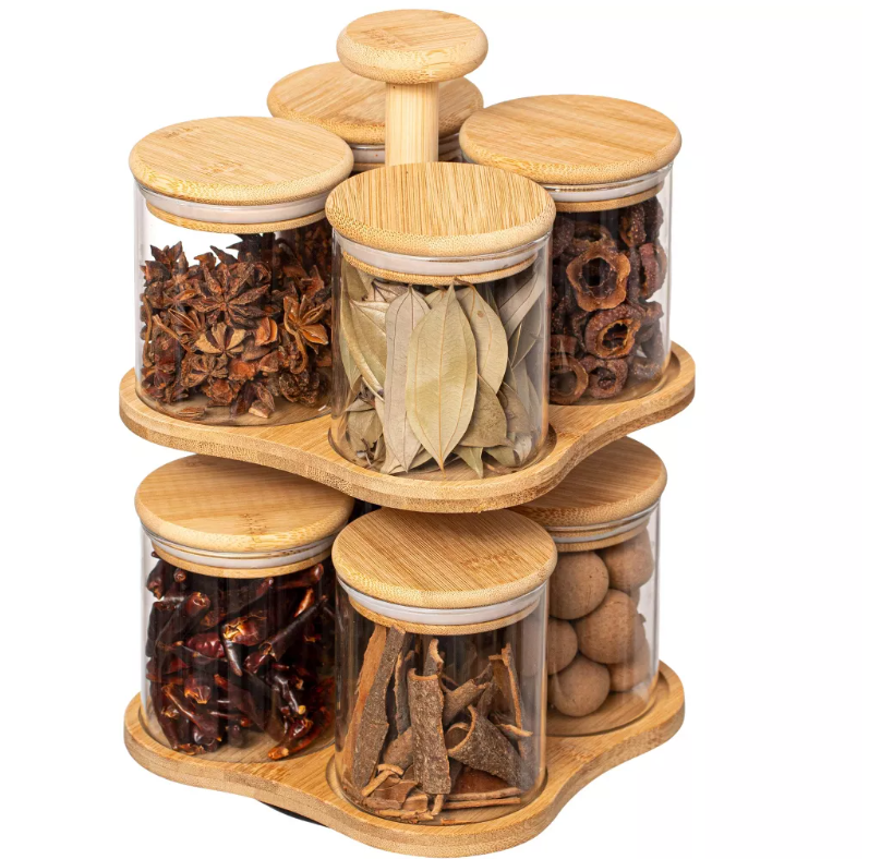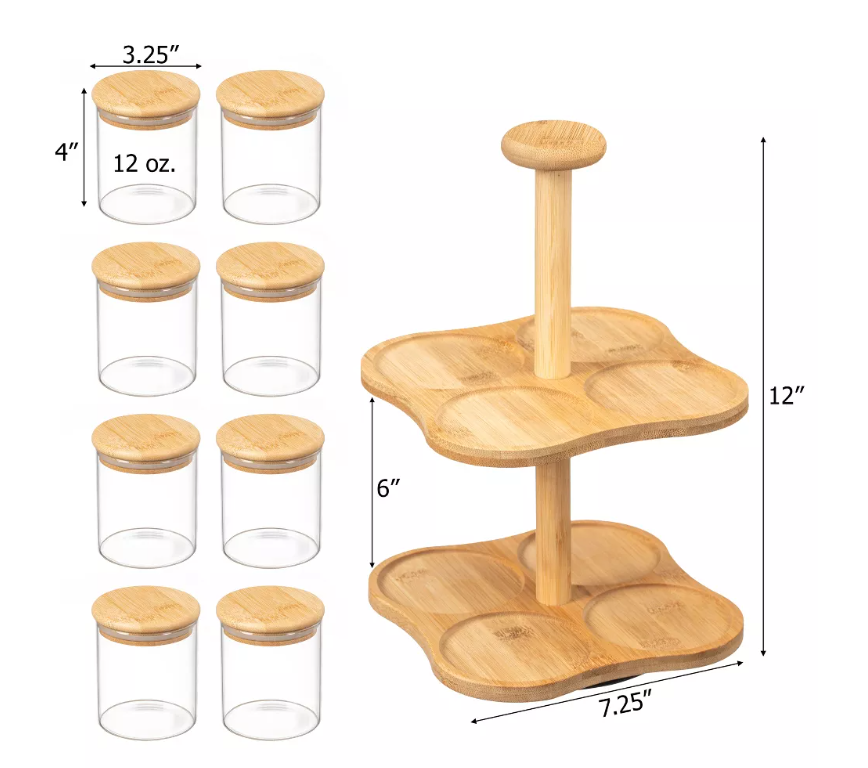 Basicwise-Tocadiscos de bambú de doble capa con 8 tarros de vidrio con tapa hermética de 12 oz, organizador de especias multiusos