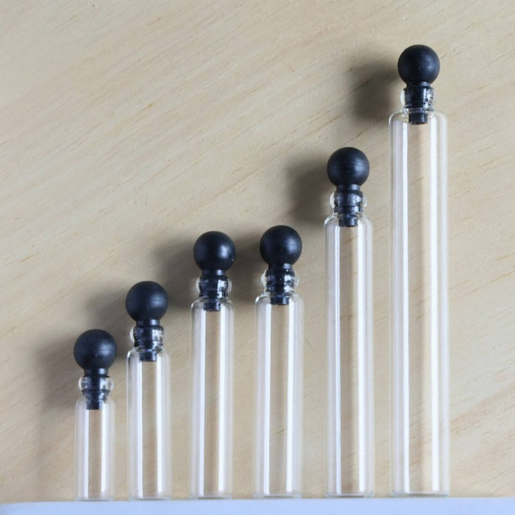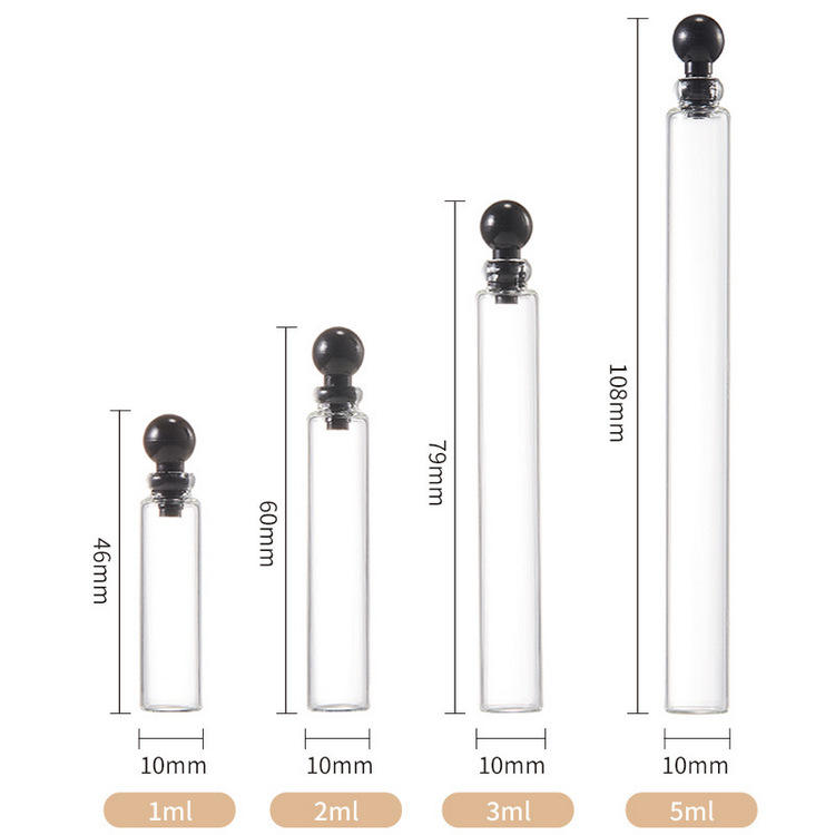 Personalizado 1mL 2ml 3ml 5ml Aceites esenciales portátiles Recarga Perfume Mini Vial Botella de vidrio con tapón negro