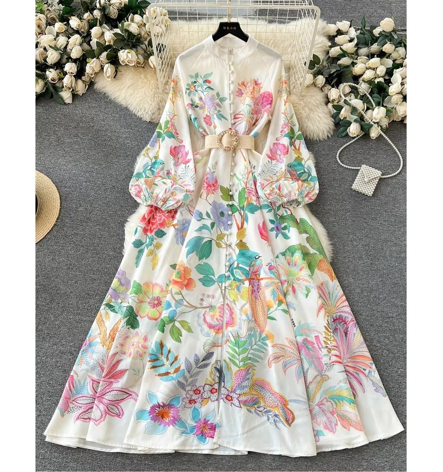 Vestido Largo Casual de Noche con Estampado Real, Cuello Alto y Botones, Primavera 2024