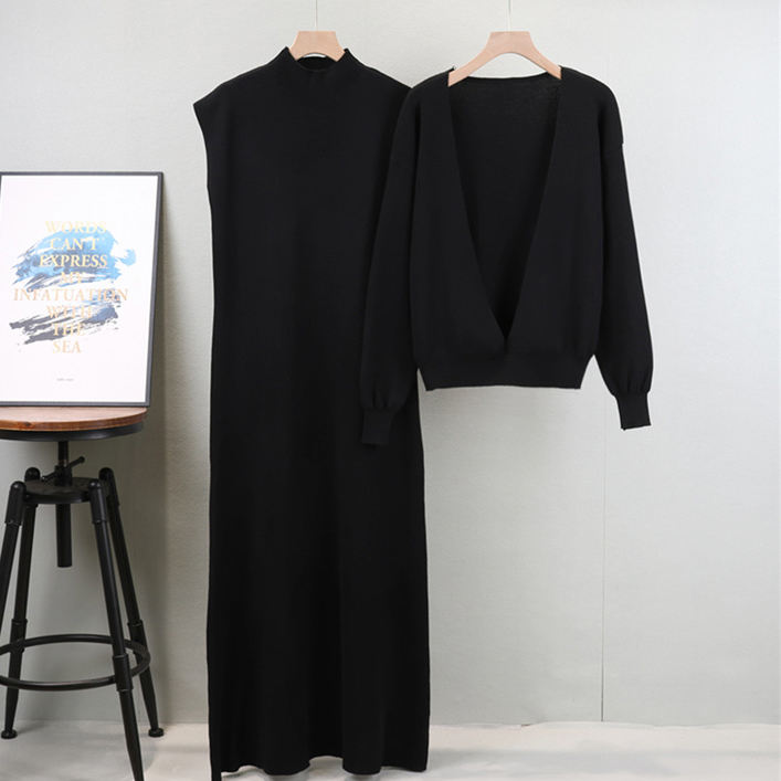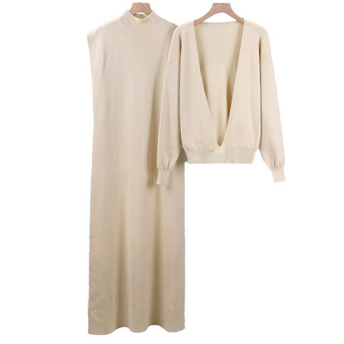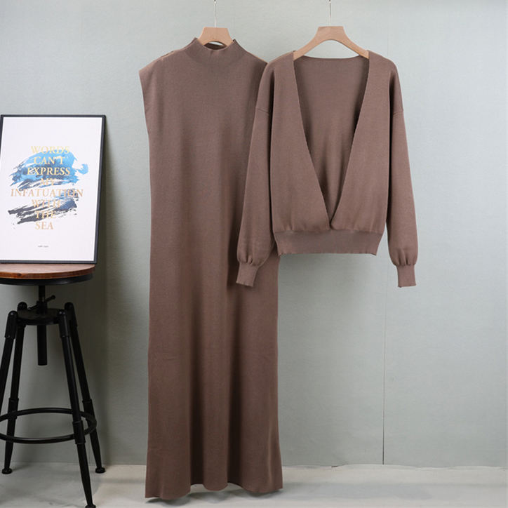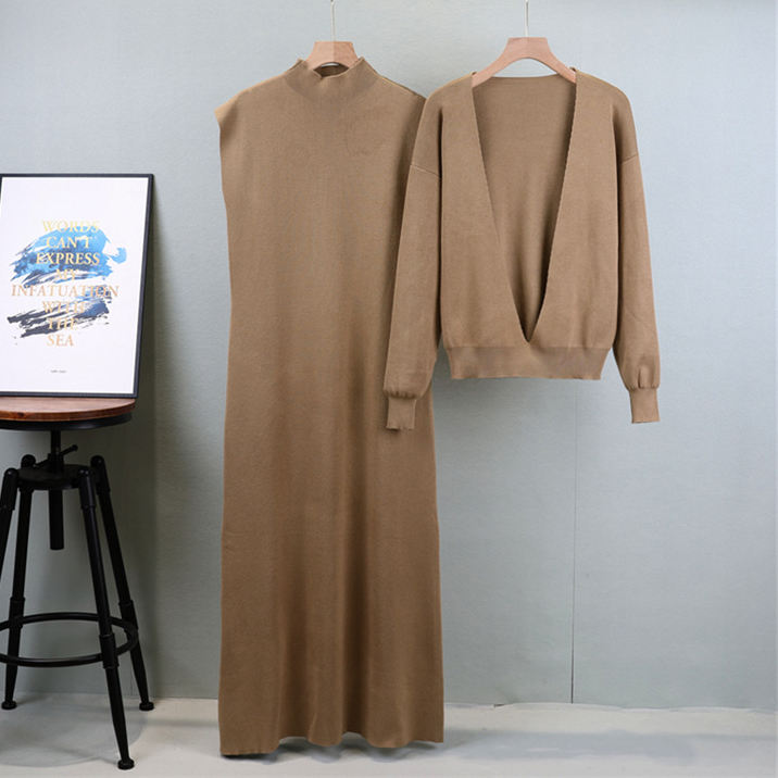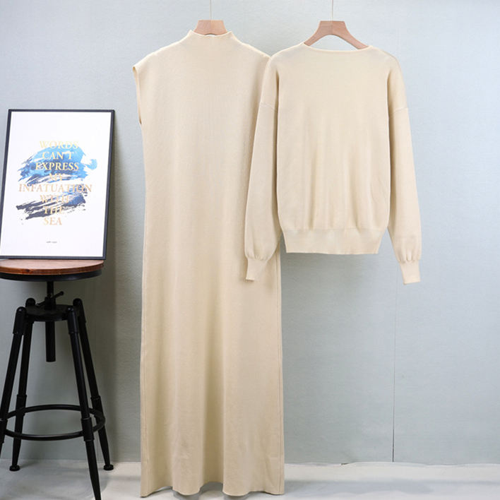 Setelan gaun rajutan dua potong untuk wanita, gaun Pullover rajut kasual elegan warna polos musim semi musim gugur