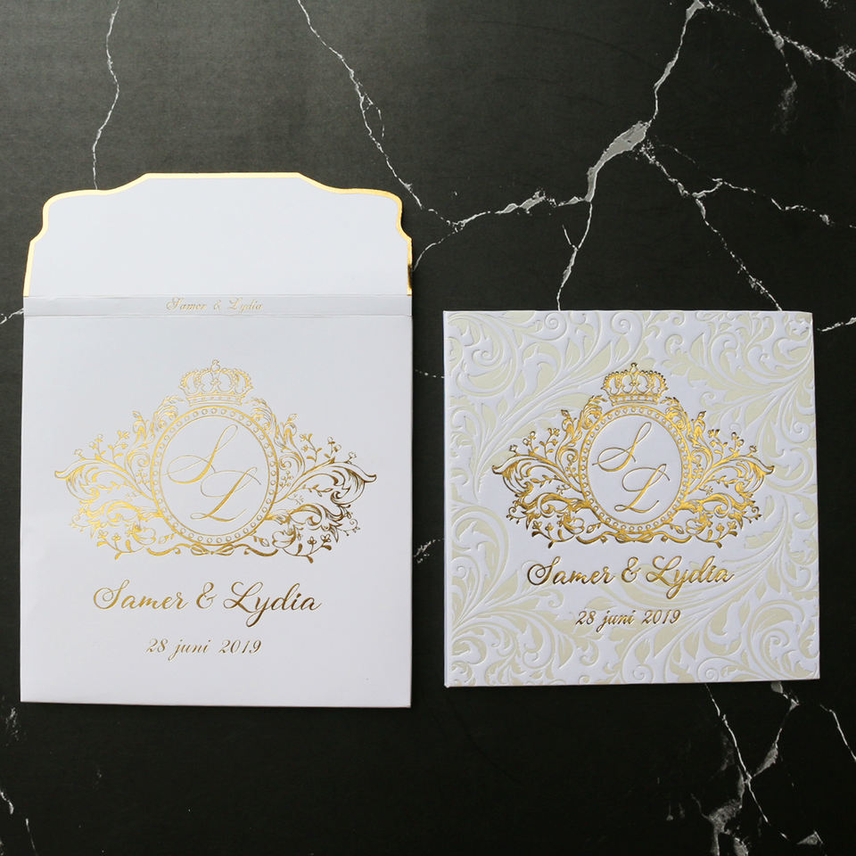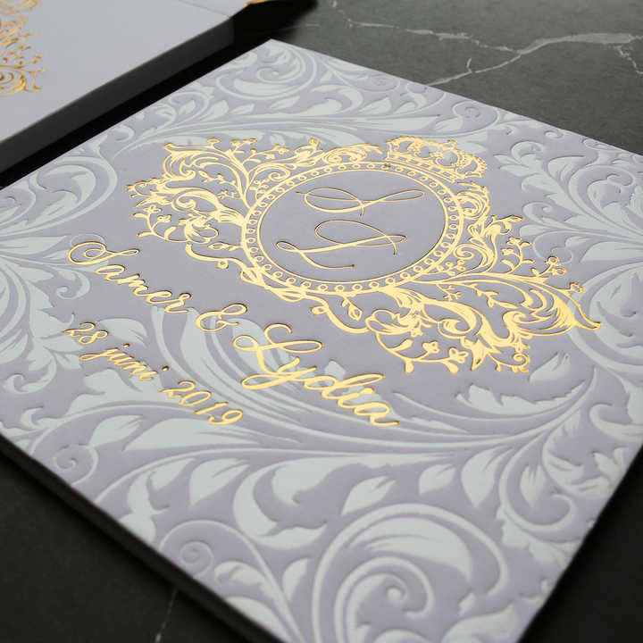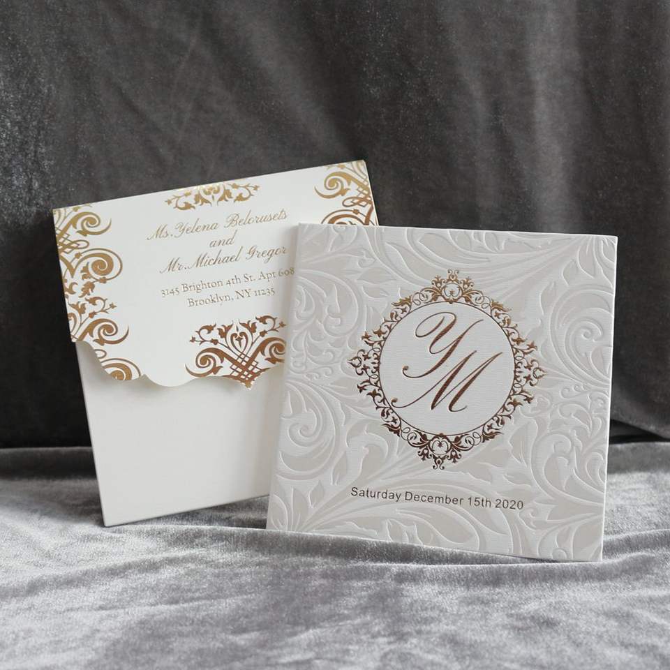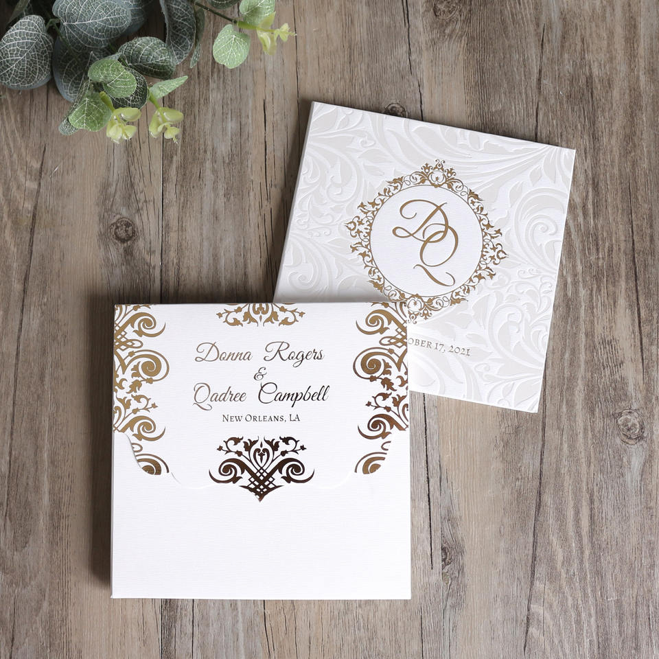 Style de livre carré avec motif de gaufrage Couverture rigide Invitation de mariage Cartes d'invitation d'anniversaire personnalisées Cartes RSVP