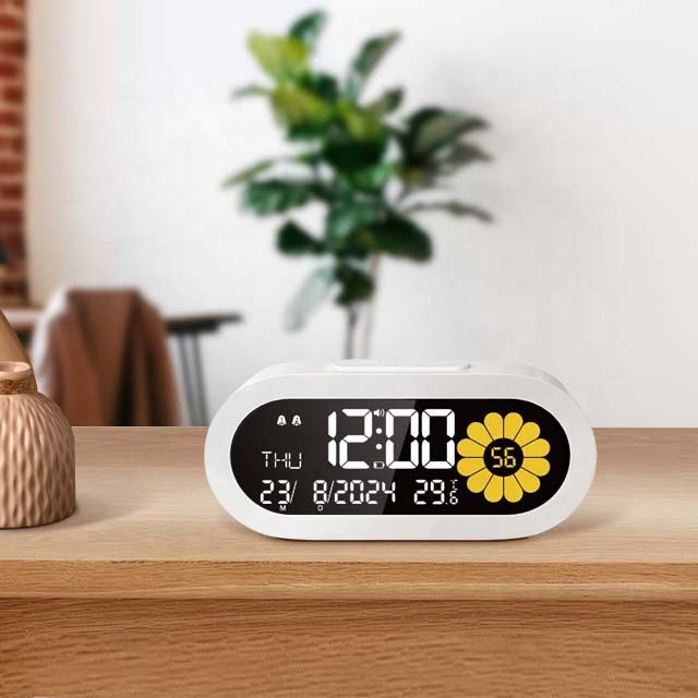 VA jam alarm visual dua warna LCD, kalender abadi 2 suhu alarm 4 nada dering tampilan kelopak