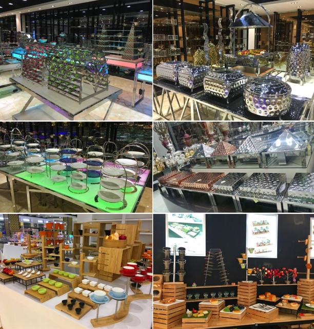 The suppliers evaluated are based in Guangdong and Foshan (China) and Dubai (UAE), collectively covering subcategories including tiered buffet risers, chafing dish stands, mobile serving carts, dessert display racks, and foldable multi-tray units. All six suppliers offer ISO-compliant manufacturing processes, with four explicitly listing CE certification or equivalent standards compliance. Five operate dedicated production facilities with in-house design and quality control teams.
